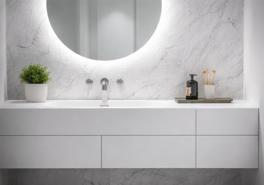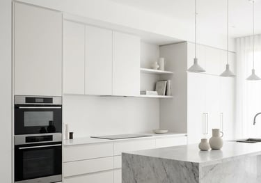 بنفس الطابع اللوني للمطبخ وجمال الأبيض اخترت خامة السيراميك مقاربة لتعطي مزيجا من الأناقة والبساطة ومواكبة العصر